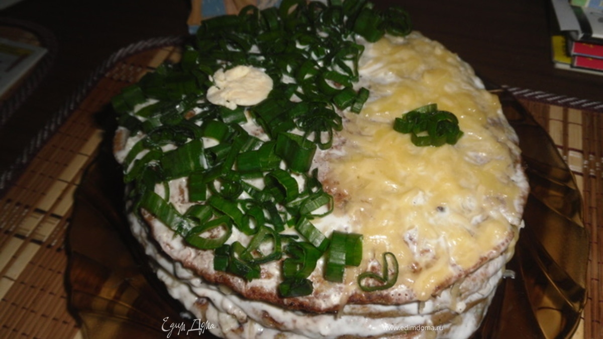 Выкладывать блинчики, смазывая их йогуртом и присыпая сыром. Украсить зел. луком. Приятного аппетита!