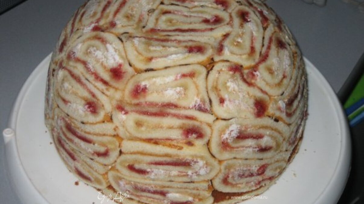 - Шаг 1Взять любую форму выслать её плёнкой и выложить тонко нарезанный рулет.взбить отдельно творог с 5л сахара и охлаждённые сливки.Всё соединить добавив ягоды и растворённый желатин.Выложить всю массу в центр и накрыть коржом.Убрать в холодильник на 3 часа.