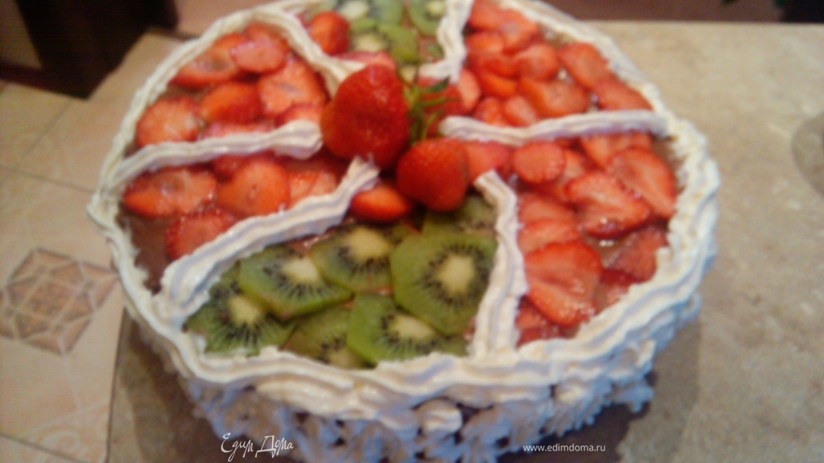 Берем сухой крем из пакетика на нем есть подробная инструкция как приготовить,главное не переборщить с молоком, иначе будет жидкий очень. Взбиваем его добавляя туда масло, сахар и молоко/сливки и тертый шоколад. Кремом намазываем, предварительно пропитанные коньяком коржи Нижний слой на крем выкладываем ломтики нарезанного банана Следующий корж намазываем кремом выкладываем клубнику и киви нарезанные ломтиками. Потом третий корж по той же технологии. Сверху украшаем взбитыми сливками с и ягодами. Все очень просто и главное вкусно!)