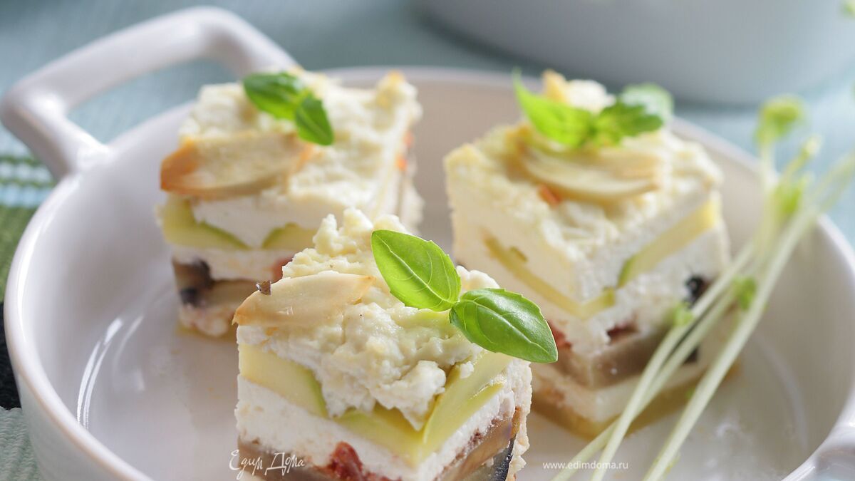 1. Нарезать баклажаны и кабачки вдоль тонкими ломтиками (толщиной около 5 мм). 2. Налить 4 ст. ложки оливкового масла на широкую тарелку, приправить солью, базиликом и перцем. Ломтики баклажанов и кабачка обмакнуть в масло и обжаривать на гриле, пока они не станут чуть помягче. 3. Помидоры ошпарить кипятком, снять с них кожицу и нарезать маленькими кубиками. 4. Разогреть в сковороде 1 ст. ложку оливкового масла и обжаривать в нем помидоры около 5 минут, чуть присолить по вкусу и отставить в сторону. 5. К творогу добавить яйца, мелко нарезанную кинзу и натертый на мелкой терке чеснок, перемешать до однородной консистенции. 6. В форму для выпечки выложить слоями: половину баклажанов (вдоль формы), 1/4 часть помидоров, 1/4 часть творога, 1/2 часть кабачков (поперек формы), 1/4 часть помидоров, 1/4 часть творога, оставшиеся баклажаны (вдоль формы), 1/4 часть помидоров, 1/4 часть творога, оставшиеся кабачки (поперек формы), оставшиеся помидоры, оставшийся творог. 7. Запекать в разогретой до 180˚С духовке 20-25минут, затем слегка остудить, нарезать на равные кусочки, выложить на тарелку и украсить листиками зелени.