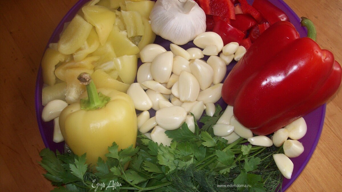Чистим чеснок (это пожалуй самое нудное занятие), перцы моем и режем небольшими кусочками. Из перцев удаляем ВСЕ семечки и белые мембранки, зелень так же моем и слегка рвем. - Шаг 1