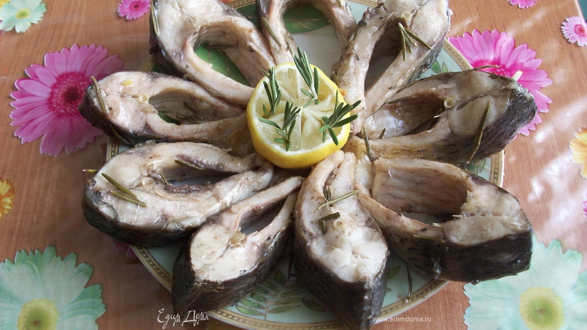 рыбу почистить, помыть, удалить голову, хвост и плавники. порезать рыбу крупными кусочками толщиной около 3 см. порезать лимон(я резала полосочками, можно дольками). взять судок (или что кому больше нравится), выложить рыбу слоями, при этом каждый слой посолить, поперчить, посыпать розмарином, лимоном, полить оливковым маслом и взбрызнуть соком лимона. оставить в холодильнике мариноваться, я ставила на ночь.