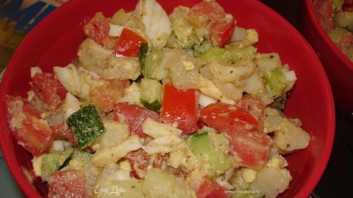 - Шаг 1Все ингредиенты нарезать кубиками, заправить перцем и маслом.