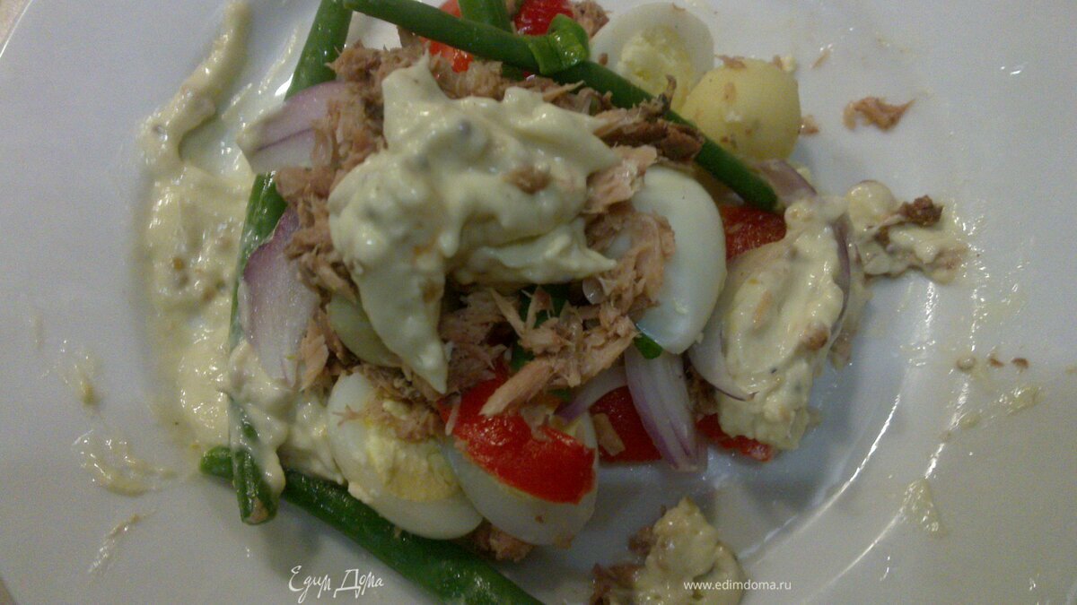 Зеленый лук измельчить. Яйца и помидоры разрезать пополам, положить в салат, посыпать каперсами, красным и зеленым луком. Все перемешать. Тунца раскрошить вилкой и выложить сверху. - Шаг 6Сделать заправку: смешать горчицу с оливковым маслом, добавить сливки, соль и перец, слегка взбить венчиком.