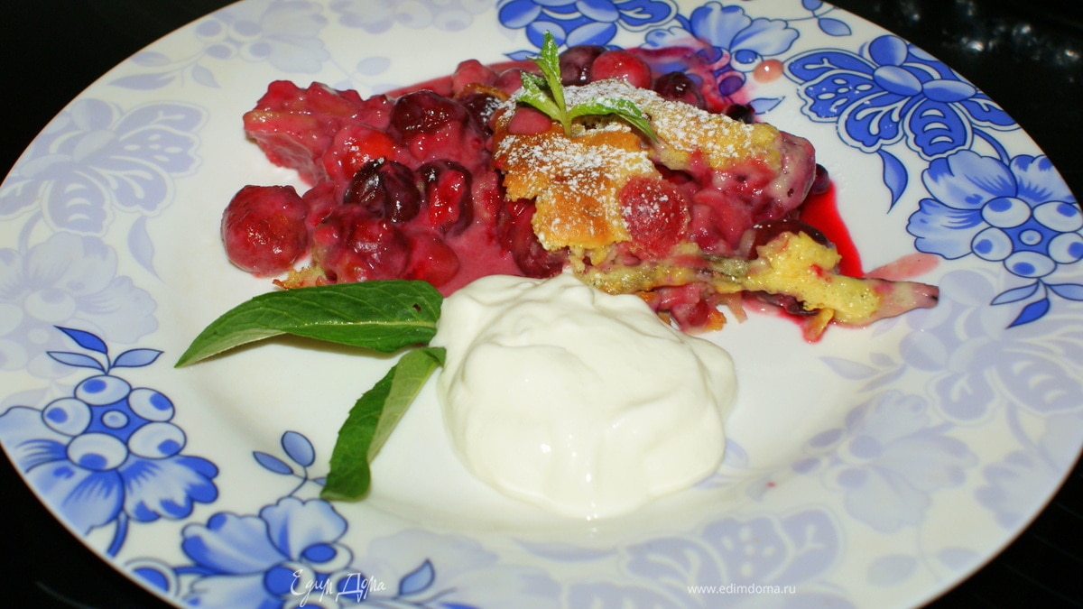 - Шаг 11. Разогреть духовку до 190 С Вишни - удалить косточки. 2. Форму для выпечки смазать маслом. Выложить вишню в форму и посыпать немного ванильным сахаром сверху. 3. Взбить яйца и сахар вместе, постепенно добавить муку и 1 щепотку соли, хорошо перемешайте. Добавить молоко, чтобы тесто получилось, как на блины. 4. Налейте тесто в форму над вишнями. Выпекать в горячей духовке в течение 40/45 минут до золотисто-коричневого цвета. 5. Посыпать ванильным сахаром и подавать горячим или холодным (со сливками или мороженым). Приятного аппетита!