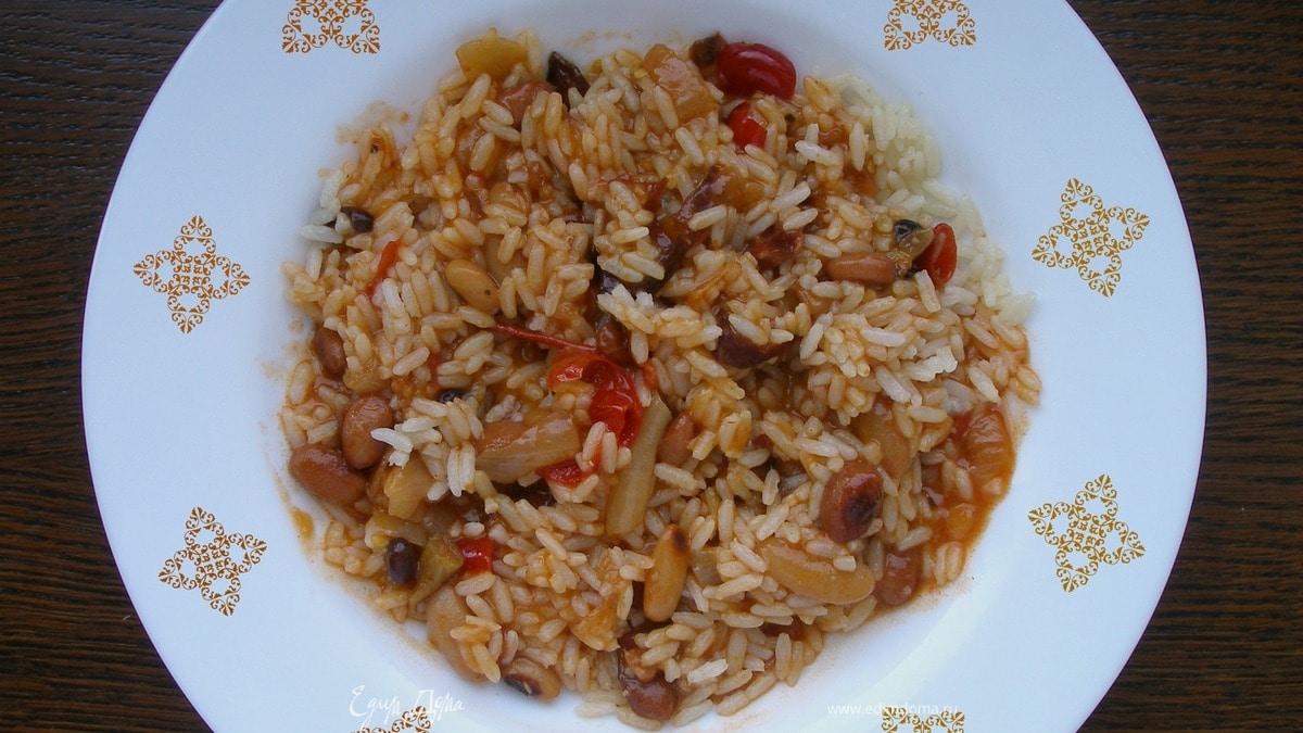 - Шаг 1Поскольку у меня была колбаса с большими кусками сала, то я не брала никакого масла или жира. Нарезала ее кусочками и подогрела в гусятнице, пока сало не растопилось. Добавила лук и продолжала готовить до его (лука) золотистой корочки. Добавить немного воды (бульона), чтобы покрывало все мясо, томатную пасту, порезанный кусочками томат, фасоль (предварительно замоченную на ночь в воде), болгарский перец, острый перец и специи. Загустить мукой, накрыть крышкой и готовить на медленном огне до готовности. Перемешать с готовым рисом и немедленно подавать! Это очень вкусно и ооочень остро, детям я даже не предлагала ;) Кстати, степень остроты можно регулировать в зависимости от собственных вкусовых пристрастий.