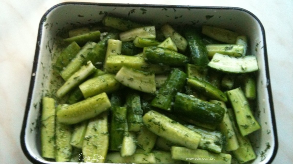 - Шаг 1Огурцы порезать на брусочки. Укроп порубить. Чеснок потереть на мелкой терке.