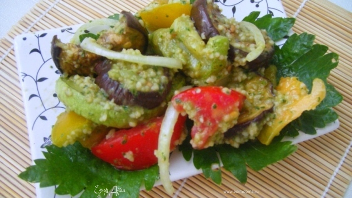 Теплый летний салат с печеными баклажанами и кускусом
