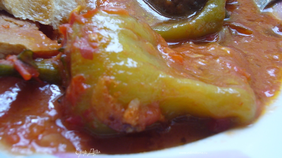 - Шаг 1Обжарь мелко порезаный лук,до золотистого цвета.Добавь мелко нарезанные томаты.Томаты тушим немного,затем добавь болгарские перцы,измельчённый чеснок,перец и соль по вкусу.Я добавляю ещё стручёк острого перца.Всё должно протушиться ещё немного и можно подавать.