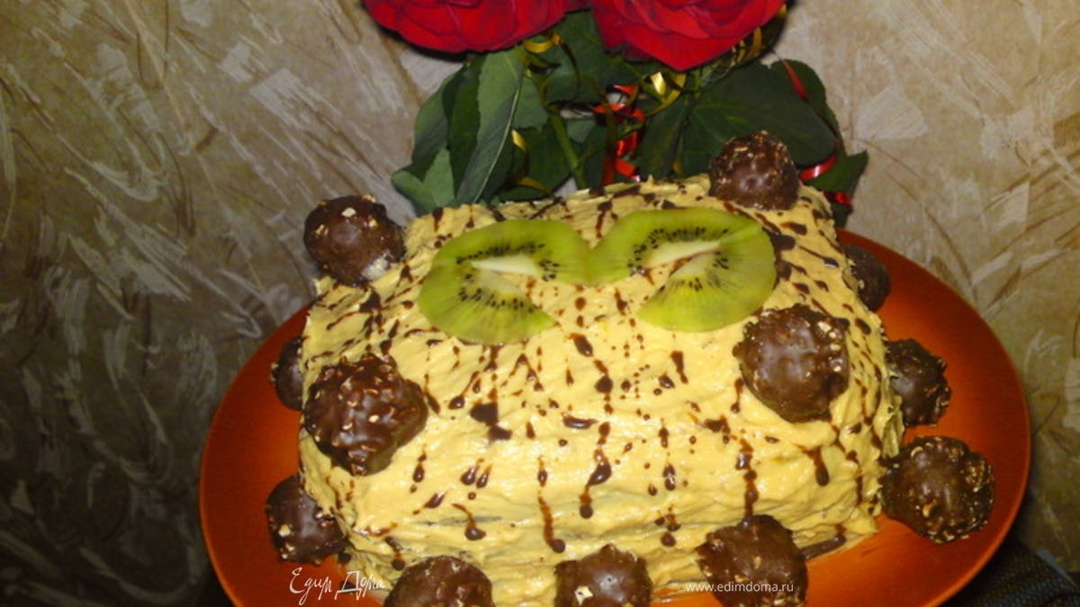 Пропитанные коржи смазываем кремом.Для которого смешиваем сгущенку с размягченным маслом и размятым бананом. Украшаем, как подскажет фантазия. Приятного аппетита!!!