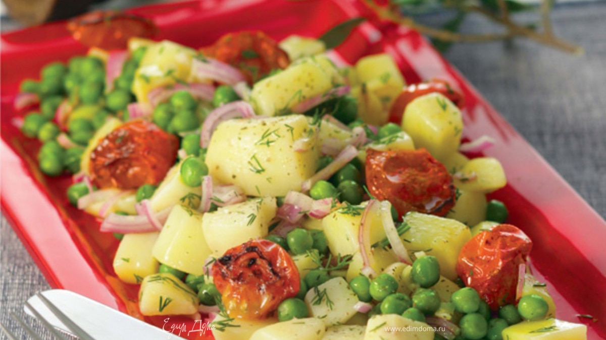 Теплая картофельная закуска с зеленым горошком, жареными томатами и укропом