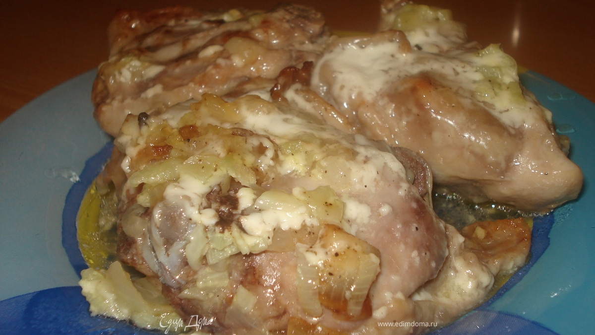 - Шаг 1Курицу разрезать на куски, посолить, положить в разогретую с маслом сковороду, посыпать мелко нашинкованным репчатым луком и сильно подрумянить с двух сторон. Затем переложить в жаропрочную посуду, добавить муку, измельченный чеснок, сметану, накрыть крышкой, поставить в разогретую духовку на 30-40 минут.