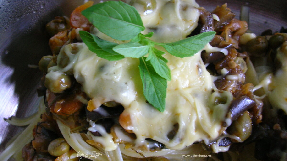 - Шаг 2Выложить в тальятелле тушеные овощи и присыпать сверху тертым сыром. по желанию украсить листьями базилика.