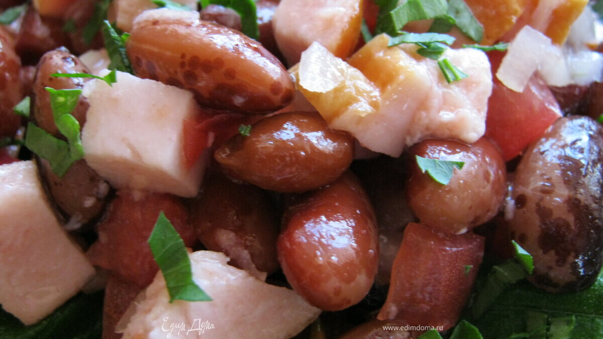 Порезать небольшими кусочками куриное филе,лук,помидоры. - Шаг 1Затем добавить фасоль,предварительно слить воду(если варили сами),если консервированная слить сок.