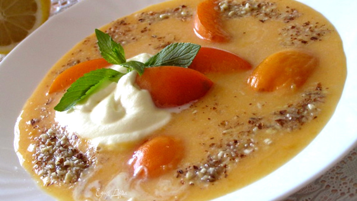 Абрикосовый суп разлить по тарелкам, посыпать миндалем, в каждую тарелку поместить взбитые сливки, добавить нарезанные дольками абрикосы, украсить веточкой мяты.