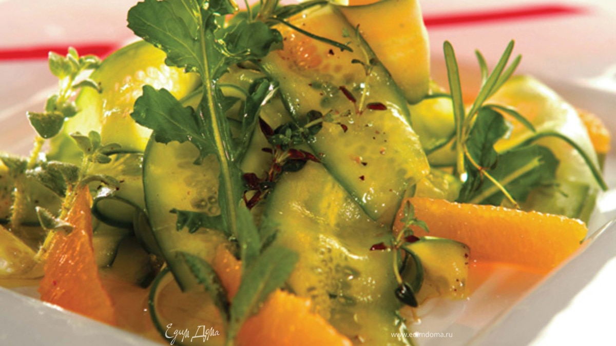 Салат из огурцов со свежими травами, дольками апельсина и цедрой