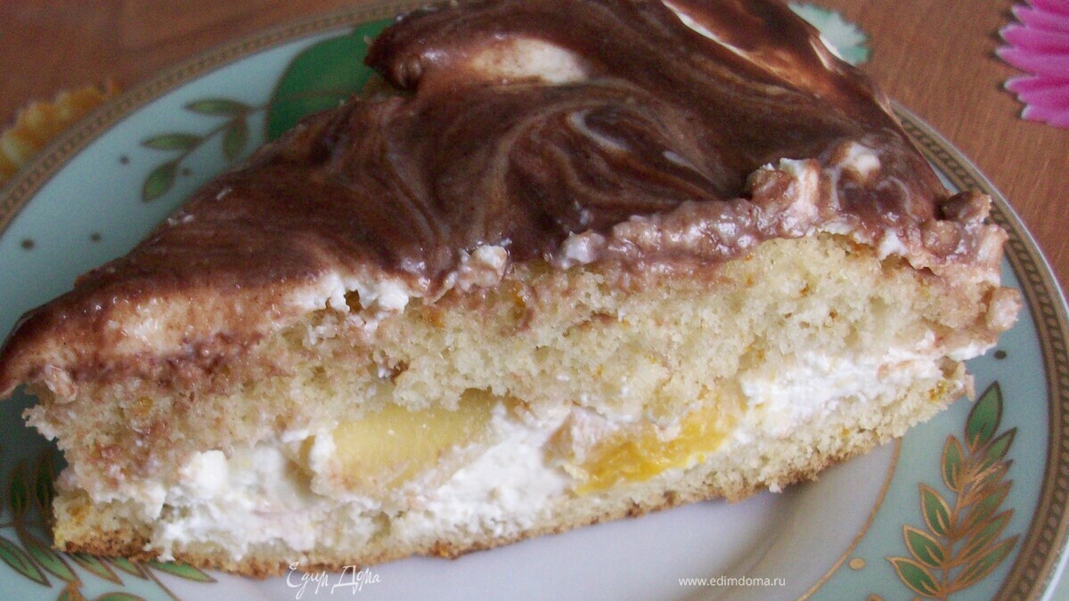 остывший бисквит, разрезаем пополам выкладываем крем и сверху фрукты - Шаг 1