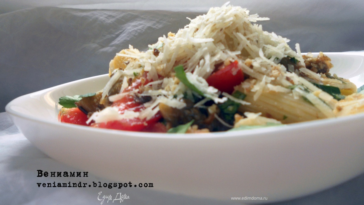 - Шаг 1Пасту отварить до готовности, промыть холодной водой ***в том случае даже итальянцы не осудят:)***. Черри нарезать половинками/четвертинками. Соединить пасту, баклажаны, черри, можно добавить еще немного ароматного масла - оливкового нерафинированного, например, или грецкого ореха. Подавать в теплом или охлажденном виде, присыпав оставшейся зеленью, сыром и орехами. Душшшшевно:)
