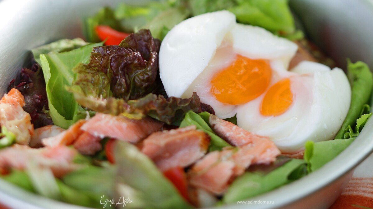 - Шаг 11. Яйца отварить всмятку (1 минута после закипания). Чтобы скорлупа не полопалась, воду лучше подсолить. 2. Залить креветки водой, чтобы она покрывала их, добавить душистый перец, лавровый лист, посолить хорошенько и довести до кипения, затем слить воду через дуршлаг и освободить креветки от головы и панциря. 3. Рыбу слегка присолить и запечь на углях, затем поломать на кусочки. (Печень трески готовить не нужно, можно, слив масло, сразу покрошить ее в салат). 4. Салатные листья промыть, порвать руками и перемешать их с креветками и кусочками рыбы. 5. Заправить салат оливковым маслом и соком лимона, посолить, поперчить и разложить по тарелкам. Сверху на салат в каждую тарелку выложить аккуратно очищенное от скорлупы яйцо.