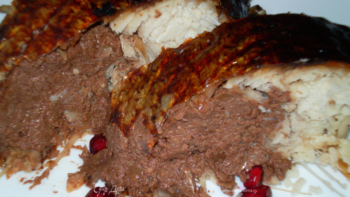 Начиняем рыбу: Рыбу почистить, промыть ,удалить жабры,просушить. Заранее приготовить смесь для промазывания: 1ч.л пасты из алычы смешать солю и перцем.Этой смесью промазать рыбу снаружи и с внутри.Заполнить очищенную рыбу начинкой лявянги. - Шаг 10