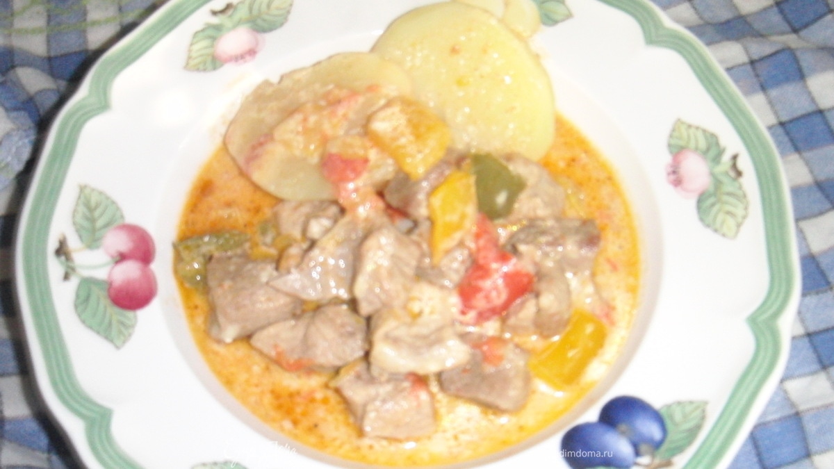 - Шаг 1Свинину слегка обжарить,затем добавить все овощи перемешать, посолить, поперчить. Тушить на среднем огне до готовности мяса.