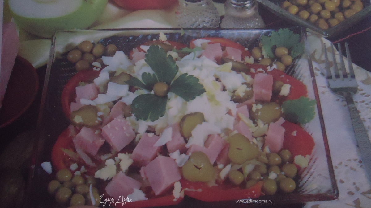 - Шаг 6Ветчину и тертое яблоко смешать и положить на кружки помидоров.