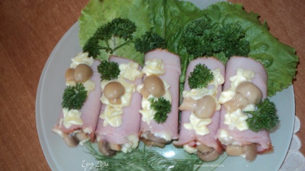 Рулетики закусочные с ветчиной, сыром и грибами.
