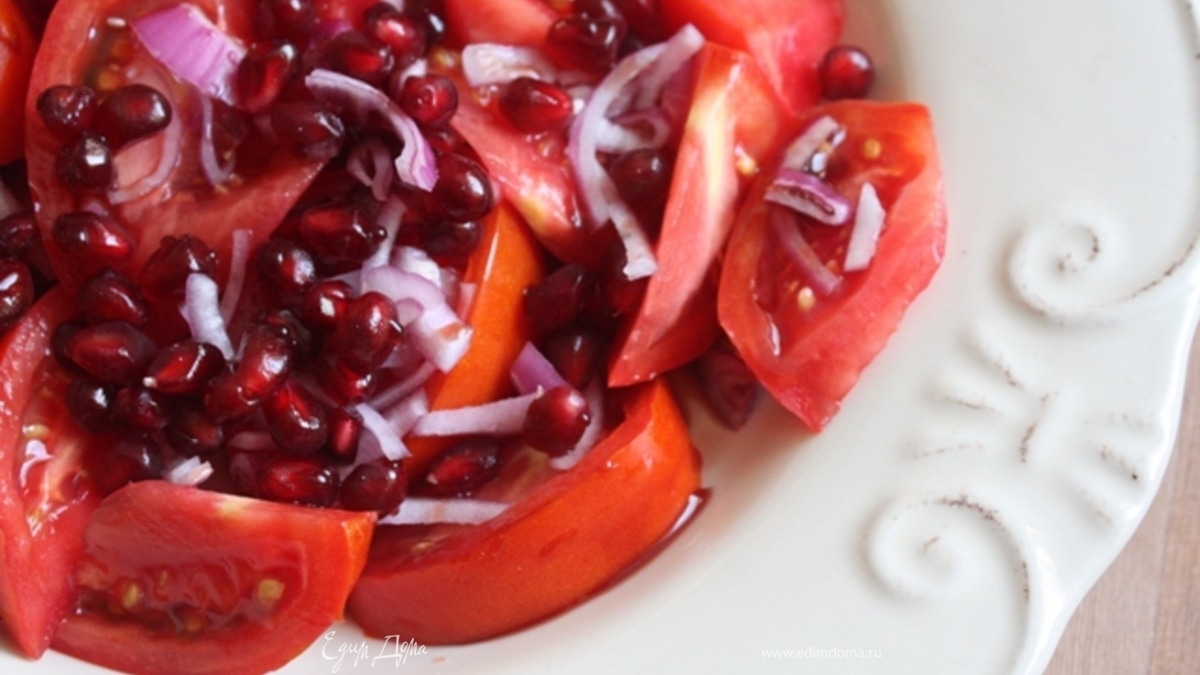 - Шаг 1Помидоры нарезать и выложить в тарелку. Лук очистить и нарезать полукольцами, выложить на помидоры. Посыпать зернами граната. Полить соусом "Наршараб" и небольшим количеством оливкового масла. Посолить и посыпать зеленью кинзы.