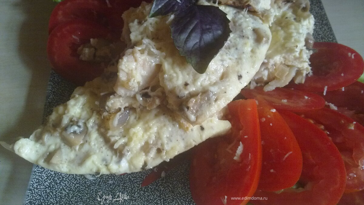 рыбу порезать небольшими кубиками (2*1 см)и замариновать в соевом соусе минут на 10. порезать мелкими кубиками лук и грибы. обжарить на оливковом масле сначала лук, потом добавить грибы, затем рыбу. Вместе жарить минут 10-15 до готовности рыбы. в отдельной посуде взбить яйца с сметаной, солью, перцем. вылить яичную массу к рыбе с грибами и хорошо перемешать, пока омлет не схватиться. накрыть крышкой и готовить на медленном огне 5 минут, потом посыпать сыром, накрыть крышкой и выключить огонь, дать постоять пару минут чтобы сыр расплавился и можно подавать. ПРИЯТНОГО АППЕТИТА!