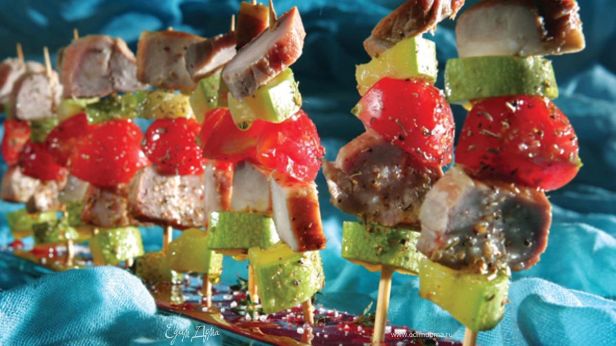 Нанизывайте поочередно на «шпажки» 2 кубика свинины, 2 кубика цуккини и половинку черри.
