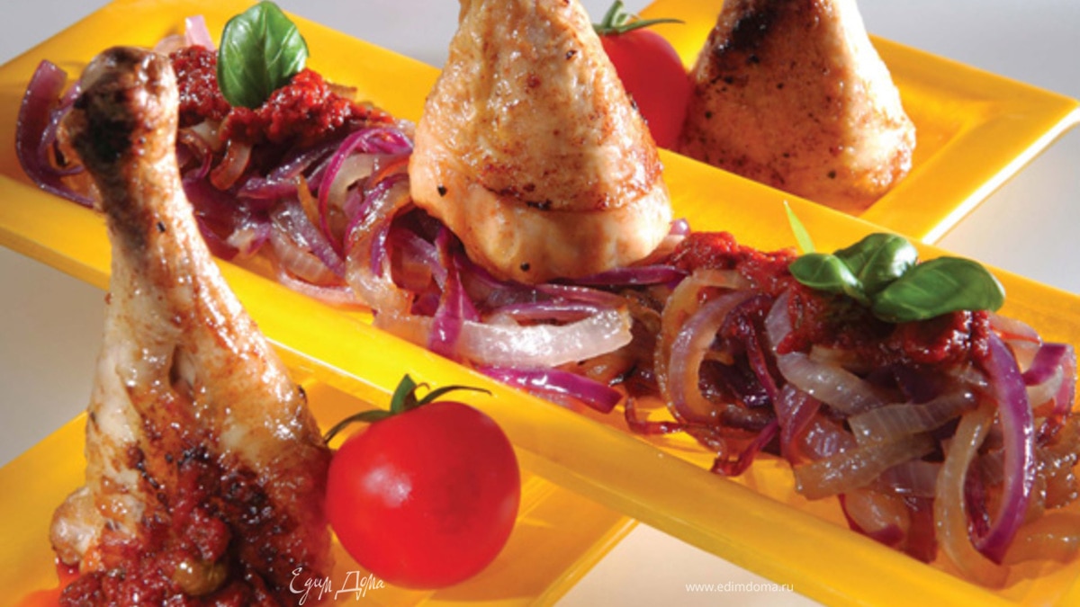 - Шаг 1Разложите курицу на 4 тарелках и полейте томатным соусом. Вокруг курицы разложите карамелизированный лук. Сбрызните небольшим количеством оливкового масла.