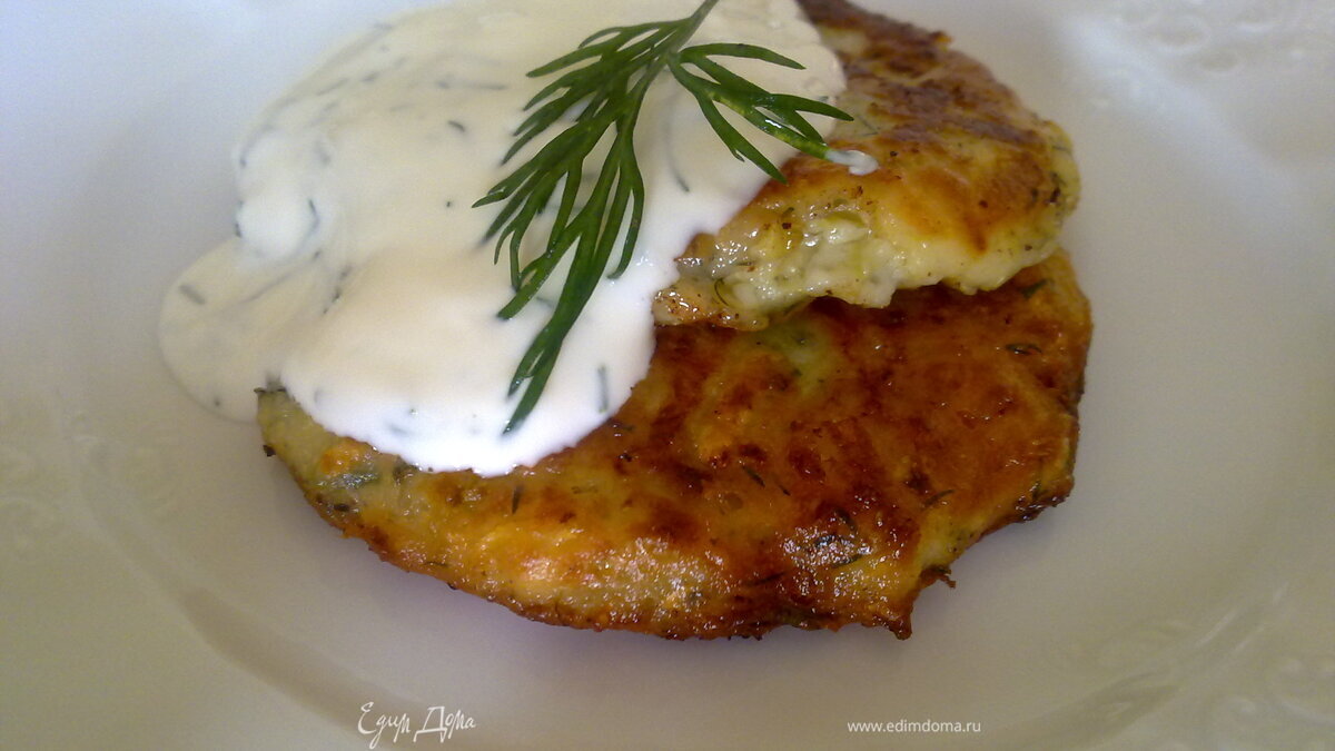 Кабачки очистить от кожицы и натереть на терке. Руками хорошо отжать жидкость из кабачков, добавить творог, яйцо, муку, соль, мелко нарезанный укроп. Жарить на сковороде как сырники. Подавать с соусом из сметаны, чеснока и укропа.
