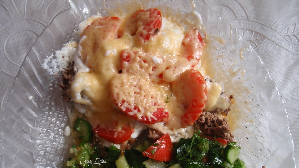- Шаг 1Печень отвариваем,выкладываем на лист, солим перчим, кладем сметану, помидоры нарезаем кружочками и выкладываем с верху посыпаем сыром с зеленью и в духовку на 10минут.