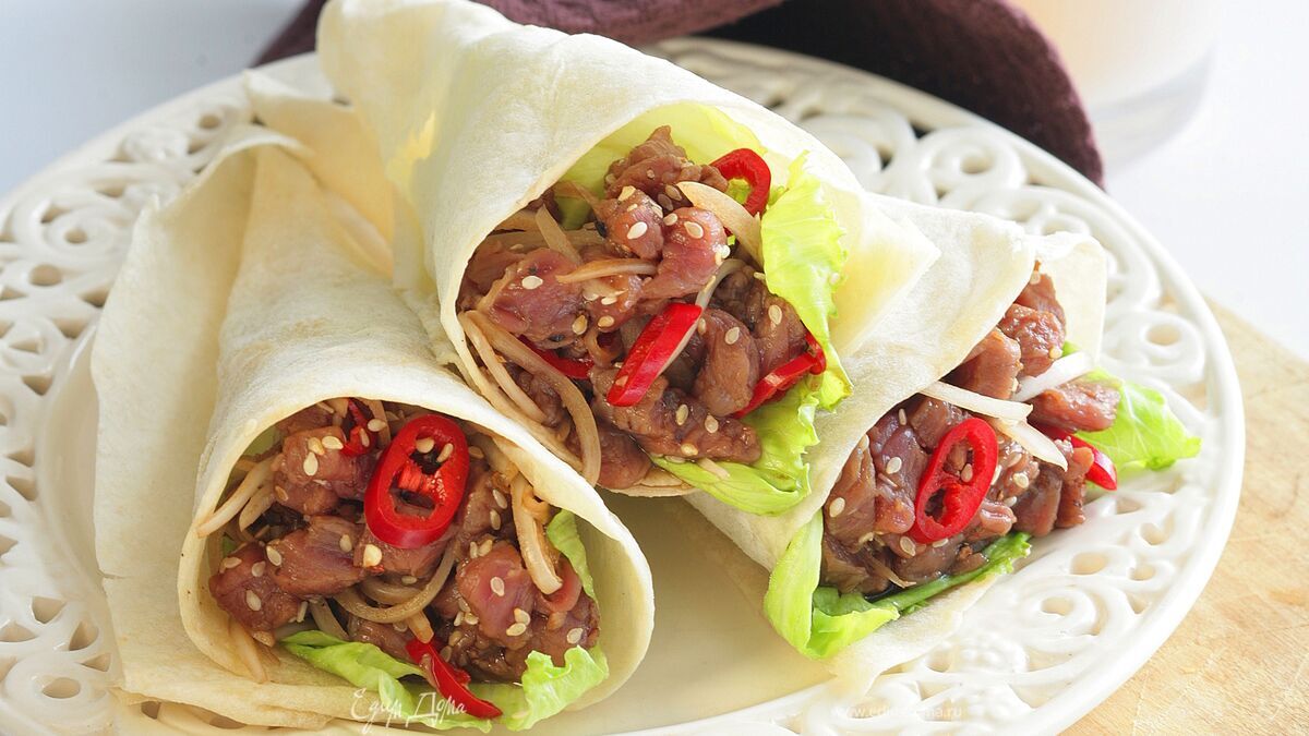 - Шаг 11. Говядину разделать таким образом, чтобы в мясе не осталось ни одной жилки, нарезать ее маленькими кубиками и замариновать в смеси уксуса, соевого соуса, молотого перца и желтка. 2. Нарезать луковицу как можно мельче и добавить в маринад. 3. Перец чили освободить от семян и очень мелко порубить. 4. Кунжут обжарить на сковороде до золотистого цвета, добавить спиртное и поджечь, чтобы пары спирта тут же испарились. 5. Добавить кунжут вместе с перцем чили к мясу и отправить все в холодильник на полтора-два часа. 6. Лаваш разрезать на восемь частей, свернуть из каждого конвертик, выложить его изнутри вымытыми и обсушенными листьями салата, чтобы лаваш не промок от маринада. 7. Ложкой выложить внутрь конвертиков замаринованное и охлажденное мясо. Украсить каждый веточкой укропа или петрушки.