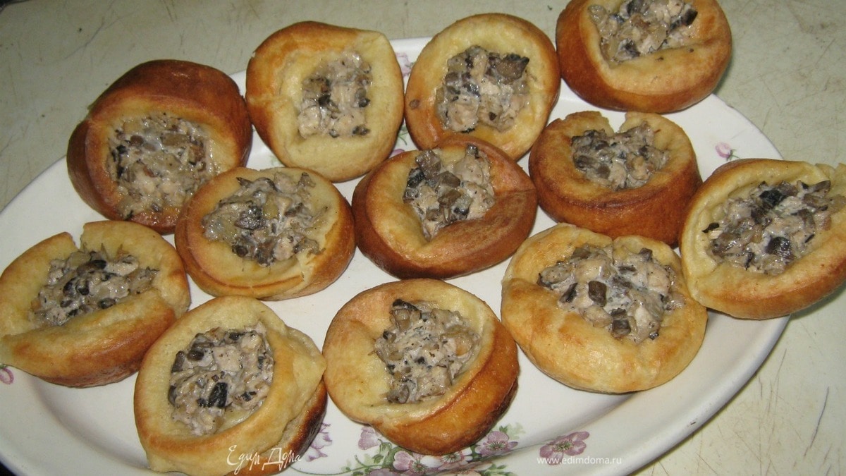 Остывшие пудинги аккуратно вынимаем из формочек и заполняем начинкой. Начинка может быть самая разная! Начиная от салатика из плавленого сырка с чесноком и майонезом до жульена. Можно делать сладкую начинку – повидло, ягоды со сливками, фрукты фламбе и т.д. - Шаг 1