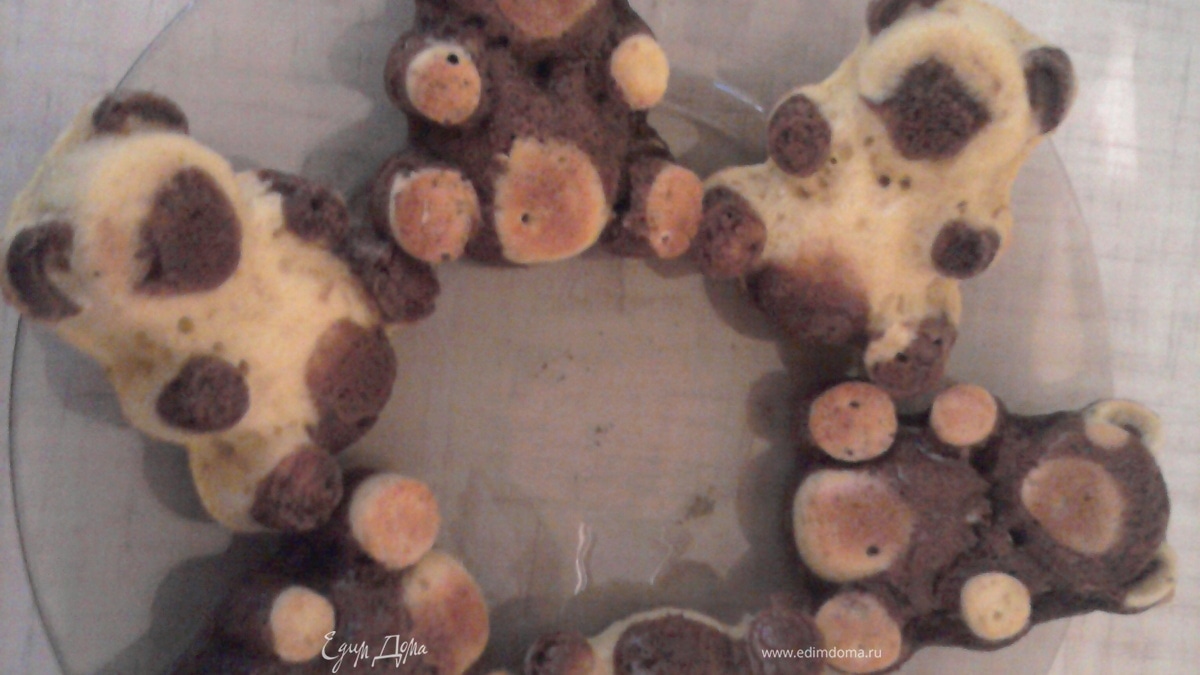 Чтобы получились разноцветные мишки, нужно тесто замесить без какао и разделить его на 2 части. В одну часть добавить 1,5 ст. ложек какао, а в другую добавить 1,5 ст.л. муки. Одно тесто набрать в кондитерский шприци немного нанести на животик, ушки, лапки, а сверху покрыть тестом другого цвета. И наоборот. - Шаг 1