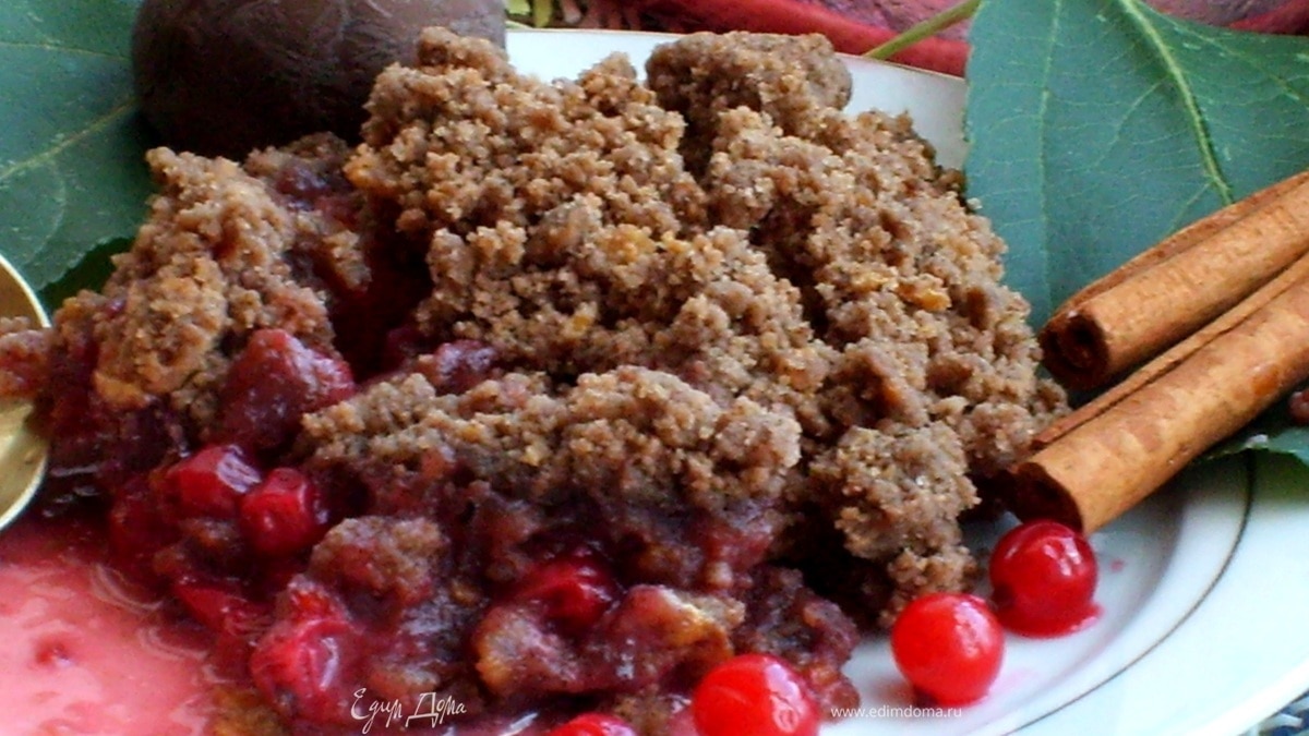 После того, как наш крамбл будет готов, при подаче можно полить сверху выделившимся карамельно-яблочно-смородиновым сиропом, получается очень и даже очень вкуусно!))) Приятного аппетита, Друзья Мои!