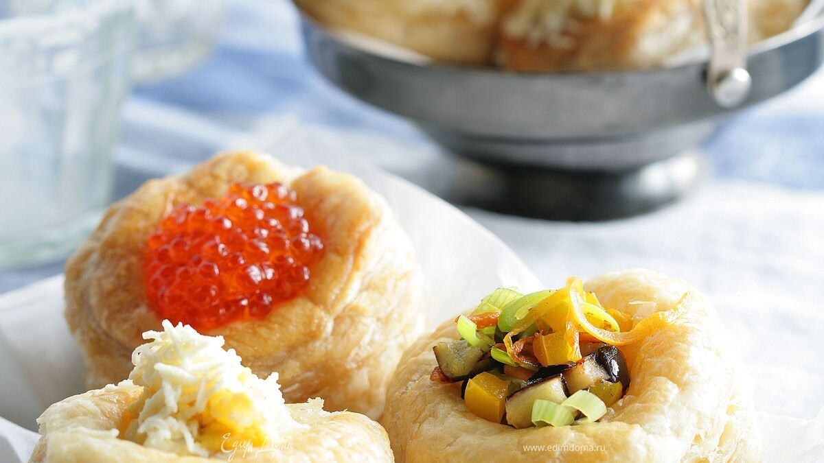 - Шаг 11. С помощью формы вырезать из слоеного теста кружки. Половину кружков отложить в сторону, а в остальных вырезать серединку, чтобы получилась форма, похожая на баранку. 2. Взбить 1 яйцо и смазать им целые кружки теста, сверху положить кружки без серединки и тоже смазать сверху яйцом. Запекать в разогретой до 160˚С духовке 15-20 минут, пока тесто не поднимется и не приобретет золотистый оттенок. 3. Овощи нарезать маленькими кусочками и обжарить на оливковом масле вместе с оттаявшим шпинатом, в конце готовки посолить по вкусу. 4. Оставшиеся яйца отварить, натереть на терке со сливочным маслом и сыром. 5. Волованы наполнить тремя разными начинками – овощной, яично-сырной и икрой.