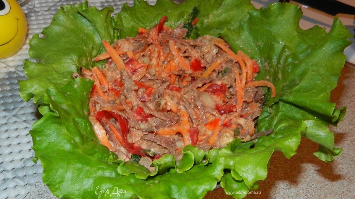 - ПодготовкаГовядину (у меня было запеченное мясо) отварить и порезать соломкой. Лук обжарить. Смешать мясо+слегка обжаренный лук и чеснок+маринованный болгарский перец + корейскую морковь. Для заправки сделала мой любимый соус – прогрела до полного растворения плавленый сыр в маринаде из-под болгарского перца (можно в бульоне, но добавить немного винного уксуса).Говядину лучше отваривать без соли, чтобы не перебить вкус других ингредиентов. Лук обжаривайте до лёгкого золотистого цвета — так он добавит салату приятный аромат, но не будет доминировать. Для разнообразия можно добавить в салат свежие огурцы или зелень.