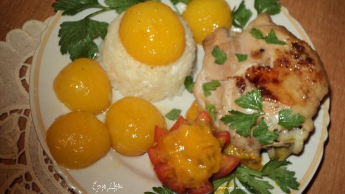 Курицу подавать с гарниром из риса, карамелизированными сливами, соусом из слив, зеленью.