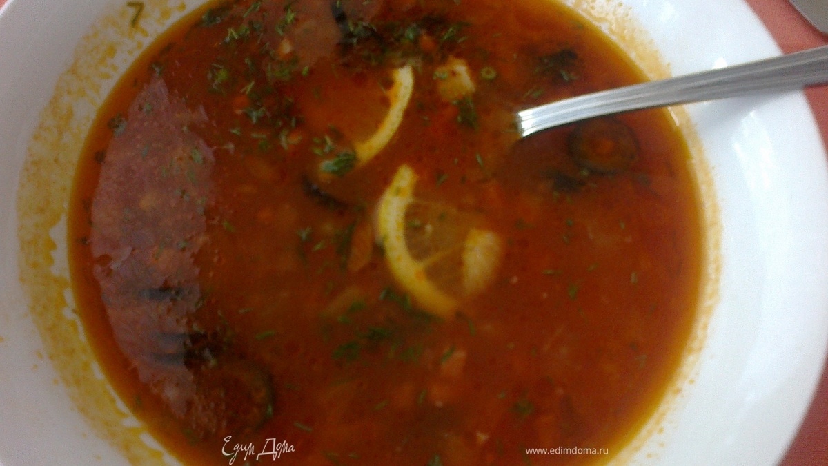 - Шаг 2Варим минут 10. Солим(только совсем чуть-чуть). и даем простояться еще минут 10. При подаче в суп кладем дольку лимона, и украшаем зеленью.