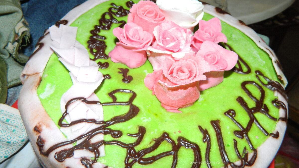 Я раскрашивала мастику в розовый, алый, зелёный, сереневый цвета. Зелёную раскатала и уложила сверху, полуился газон.Сиреневой обкрутила бока, а из остальной накретила роз. - Шаг 8