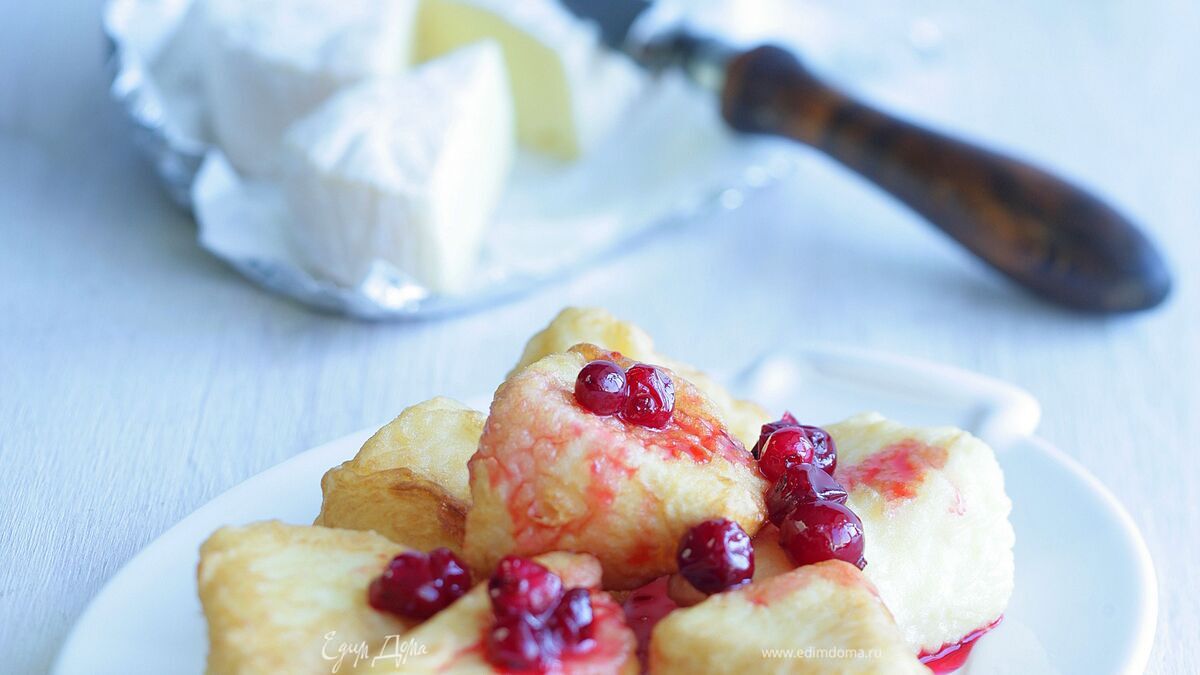 - Шаг 11. Клюкву высыпать в сковородку, добавить сахар и варить, пока сок от клюквы не уварится в два раза. 2. Камамбер нарезать на дольки. 3. Муку смешать с яйцами, сливками, кунжутом и солью. 4. Нагревать масло, пока от него не пойдет легкий дымок. Каждый кусочек сыра макать в жидкое тесто (желательно не брать руками, а накалывать на деревянную шпажку, чтобы тесто обволакивало сыр полностью), и аккуратно опускать на 1 минуту в масло. Обжаренные кусочки сыра выложить на тарелку, полить соусом и украсить половинками винограда.
