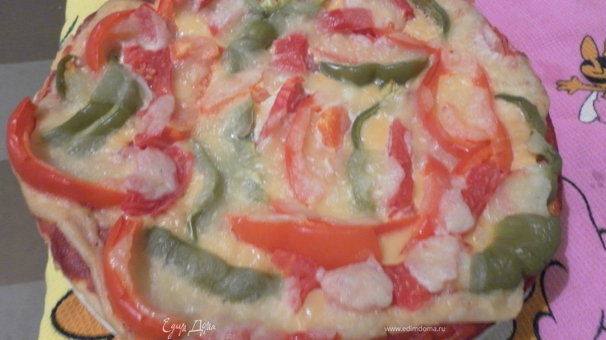 - Шаг 1*Дрожжи растворить в теплом(но не горячем,а то дрожжи сваряться)молоке,добавить сахар,перемешать.Поставить в теплое место на 15мин. *Яйца немного взбить,добавить соль,масло,перемешать. *Смешать с опарой. *Постепенно всыпать муку,замесить тесто. *Накрыть полотенцем,поставить в теплое место на 30мин. *Раскатать тесто толщиной 5мм,положить на форму смазанной маслом. *Выложить начинку,поставить пиццу на 20 мин. в духовку разогретую до 180градусов. Начинка: красный и зеленый перец моцарелла-130гр. томатная паста-70гр. сыр(у меня нарезка,примерно 6 ломтиков) помидоры-2шт. пецец,соль по вкусу.