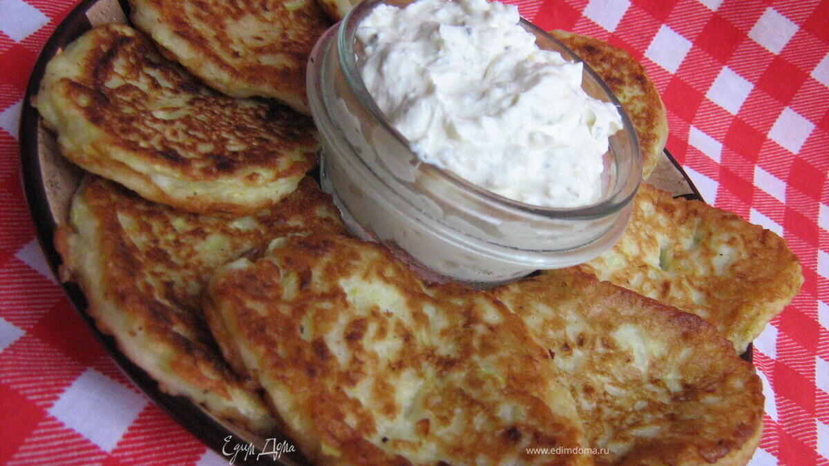 Кабачково-луковые оладьи с творожно-йогуртовым дипом