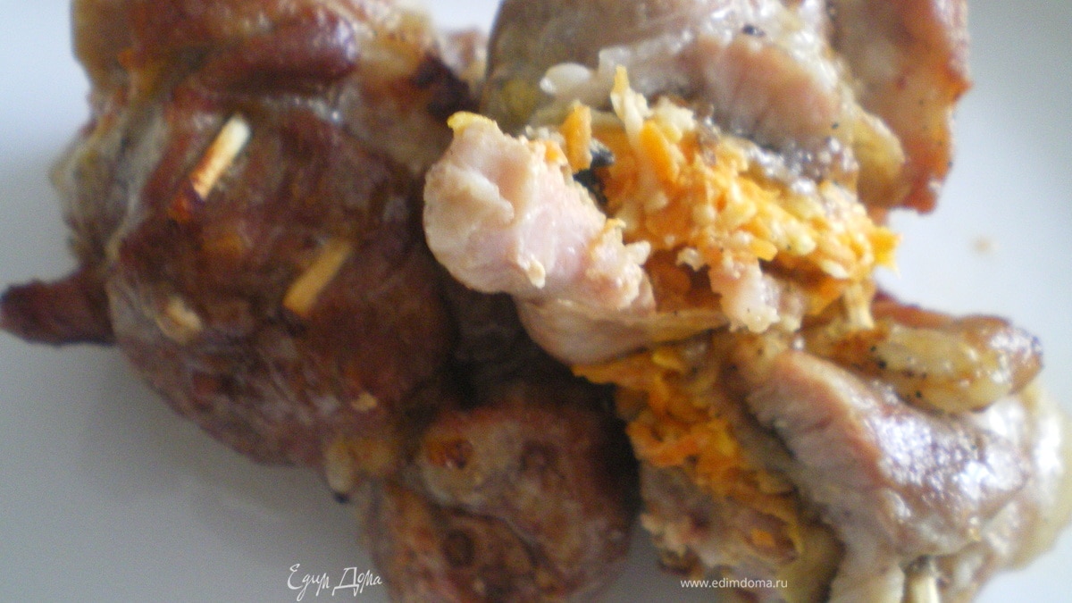 Мясо нарезать на куски и отбить. Посолить, поперчить. Баклажаны нарезать тонкими ломтиками и обжарить на растительном масле. Морковь натереть на тёрке, добавить измельчённый чеснок и запрвить майонезом. На отбивные мяса положить ломтик баклажана, сверху морковь и свернуть в рулетик. Сколоть зубочистками или обвязать нитью. Обжарить на сковороде 5 минут. Затем выложить рулетики на противень и запечь в духовке 30-40 минут. Перед подачей вынуть зубочистки.