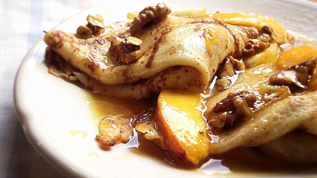 Крепы с карамелизированными персиками,грушами и грецкими орехами