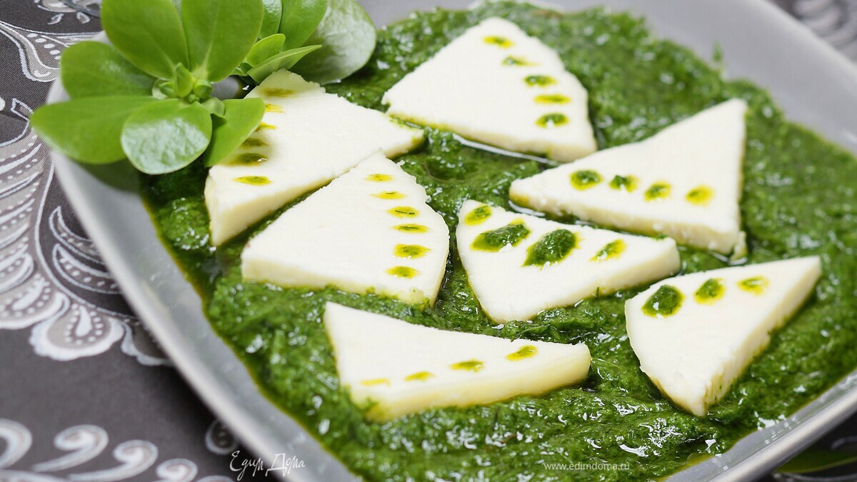 - Шаг 11. Всю зелень промыть, крупно нарезать и поместить в чашу для блендера. 2. Добавить соль, специи, оливковое масло, сок лимона и измельчить до однородной консистенции. 3. Сыр нарезать кусочками толщиной в 1 см. 4. Поместить кусочки сыра в сковороду, заправить соусом и нагреть, но не доводить соус до кипения, иначе он потемнеет. 5. Выложить сыр с соусом на блюдо и подавать к столу, украсив листьями зелени или салата.