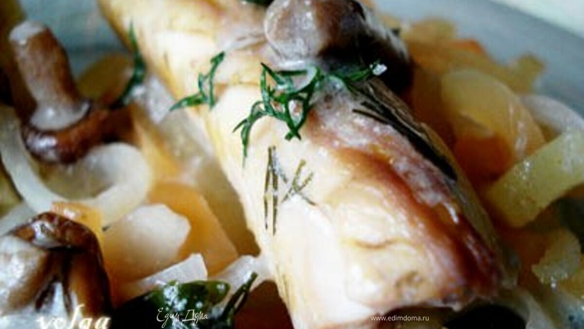 Сварить рис с шафраном.Теперь можно гарнировать блюдо. Рис переложить в форму или кондитерское кольцо. На овощную подушку положить рыбу и полить теплым грибным соусом.
