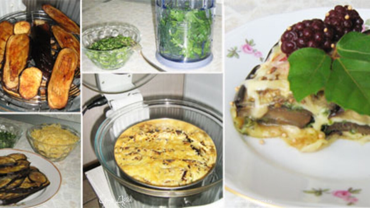 - Шаг 1Баклажаны нарезаю и обжариваю до мягкости в аэрогриле (t=260 °С, скорость высокая), вымытую зелень вместе с очищенным чесноком измельчаю в блендере, сыр натираю на крупной терке. Затем слоями выкладываю в форму, начиная со слоя баклажанов. Если Вы не боитесь поправиться, сыр можно смешать с небольшим количеством майонеза. В этот раз я его не использовала, и слой сыра делала очень тонким, только для склейки слоев. Не забудьте каждый слой баклажанов натереть измельченной зеленью с чесноком. Верхний слой баклажанов я тоже присыпала сыром и поставила в аэрогриль (t=260 °С, скорость высокая) на 20 минут. Когда запеканка остынет, ее легко можно нарезать на кусочки и украсить по вкусу. В своем эксперименте я использовала ежевику и мне очень понравилось сочетание острых баклажанов с кислым вкусом ягод. Попробуйте, это интересное вкусовое сочетание.